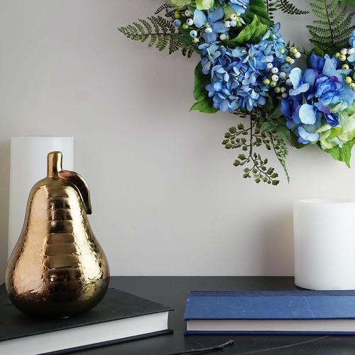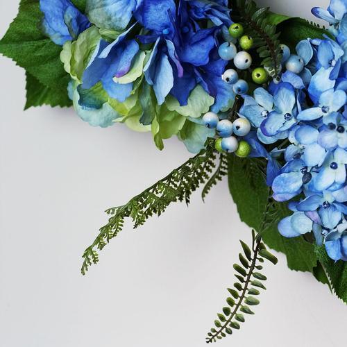 This charming wreath features blue and green hydrangeas mixed with berries and ferns to create a wonderful addition to any decor No assembly required - wreath comes in 1 piece Comes ready to hang on an artificial green branch ring Recommended for indoor use Dimensions: 24" diameter (measured from outermost tip to outermost tip) Material(s): PE/fabric/foam