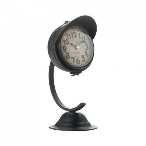 This unique black clock will brighten your room while keeping perfect time! The iron framework features a bell-shaped base, curved arm, and a cool clock with an iron visor. It adds a dash of vintage charm to any space.
