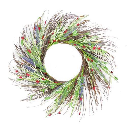 Delicate red cream and purple wild flowers are accented with green leaves in this decorative spring wreath Rests atop a beautiful twig base No assembly required wreath comes in 1 piece Recommended for indoor use only - if using outdoors place under a covered area Dimensions: 25" diameter (measured from outermost edge to outermost edge across the wreath) Material(s): polyester/plastic/wire/twig