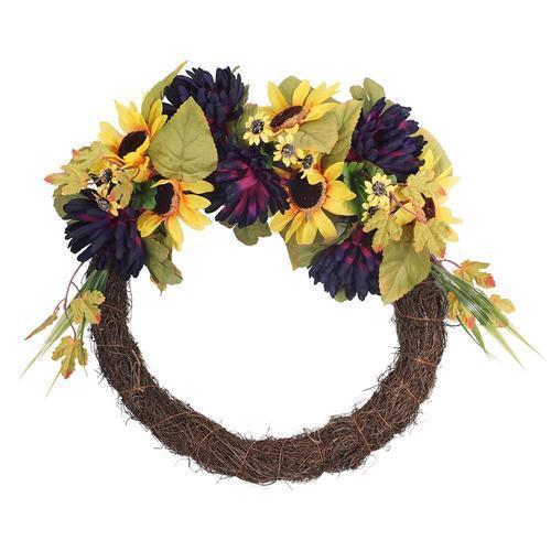 Vibrant yellow sunflowers mixed with deep purple mums create a cheerful vibe that is perfect for Spring or Summer Flowers cover half of the wreath 1 piece design no assembly required Comes ready to hang on a brown artificial twig frame Recommended for indoor use Dimensions: 20" outer diameter (measured from outermost tip to outermost tip) 13" inner diameter Material(s): fabric/PE/twig