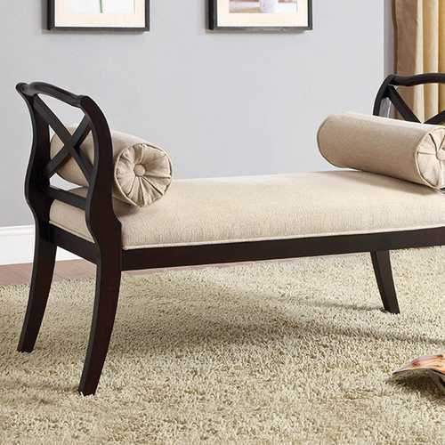 This Elegant Bench Has A Padded Seat And Matching Pillows In A Neutral Fabric, Curved Cross-Design Armrests And Is Finished In Espresso Color.