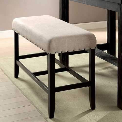 Rustic Charm Hits Its Peak With This Stunning Counter Height Bench. The Rustic Wood Grain And Distressed Black Finish Take You To A Charming Farmhouse Somewhere In The Countryside, Achieving An Inviting, Homey Atmosphere That Will Have Family And Friends Coming Back For More. Ivory Linen-Like Upholstery Adds A Brightening Effect While The Seat Is Adorned With Nailhead Trim.
