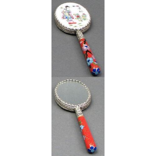 Hand Mirror with Lady & Cloisonne HandleMeasures: Porcelain base mirror measures 2"W x 6.25"H x .5"D.