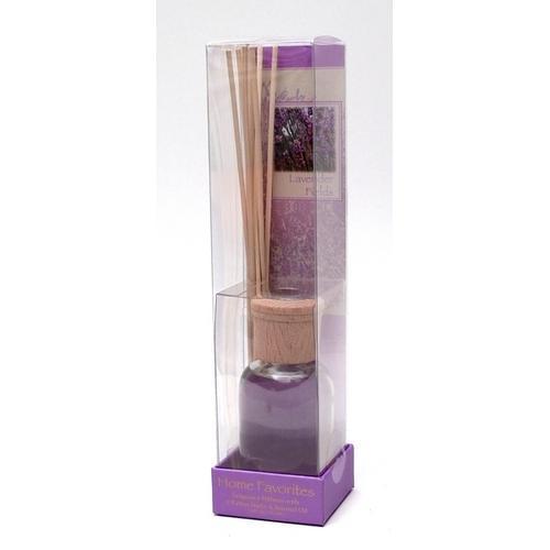 Home Favorites Diffuser - Lavender Scent - This diffuser slowly releases the soft aroma of vanilla bean, bringing a constant and subtle air of freshness to the environment. Elegant glass bottle is filled with 4 oz. of perfumed oil, which lasts for 3-4 mos. Eight wooden reeds absorb the oil and softly diffuse it into the room. Refreshes a bedroom, bathroom, living area or office without fire, smoke or burning. Measures 10" x 2" x 2".