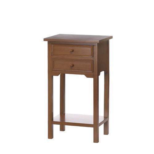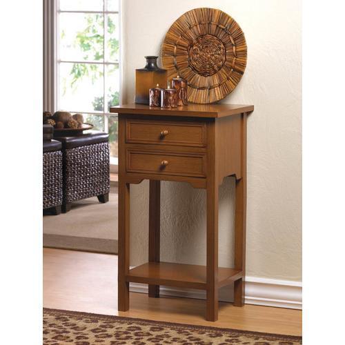 Your search for the perfect table has ended! The simply elegant design features two pullout drawers and a lower shelf thats perfect for a pretty display or extra storage. Nestle it next to your sofa, your bedside or anywhere you need a touch classic style.This wood table has a rich brown finish and two drawers that feature stylishly simple pulls. Item weight: 10.4 lbs. 15 3/4" x 11 7/8" x 27 1/8" high. MDF and pine wood. UPC: 849179017712.