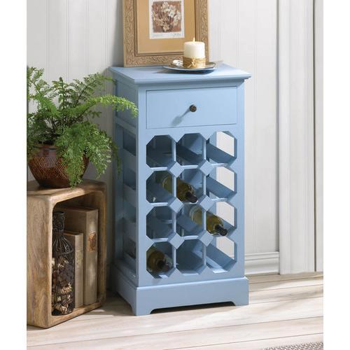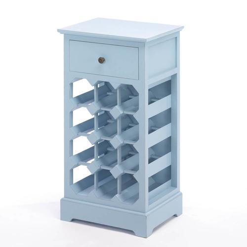 What a noble way to store your favorite wine! This lovely storage cabinet features a pullout drawer at top and seats 12 bottles of vino below. The calming shade of blue will showcase your great taste in decor and wine!Item weight: 26.2 lbs. 17¾" x 14¼" x 34" high. MDF wood. Wine bottles not included. UPC: 849179019143.