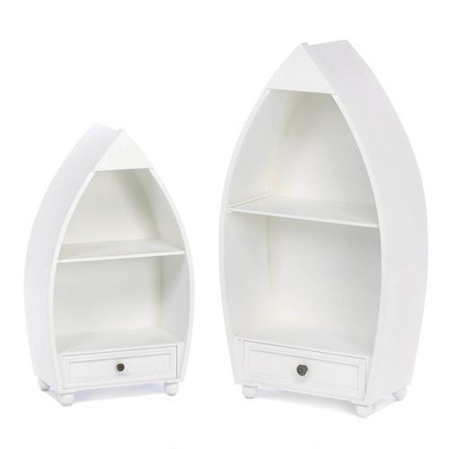 Style Ahoy! This charming white rowboat curio cabinet duo brings nautical spirit to your room while displaying some of your favorite keepsakes. Set them next to each other for maximum impact, or separate them to spread their seafaring charm across your room!Large: 18¼" x 9½" x 35½" high; small: 15" x 8" x 26¾" high.Item weight: 22.6 lbs. MDF wood. Set. UPC: 849179019167. Some Assembly Required