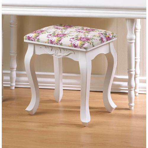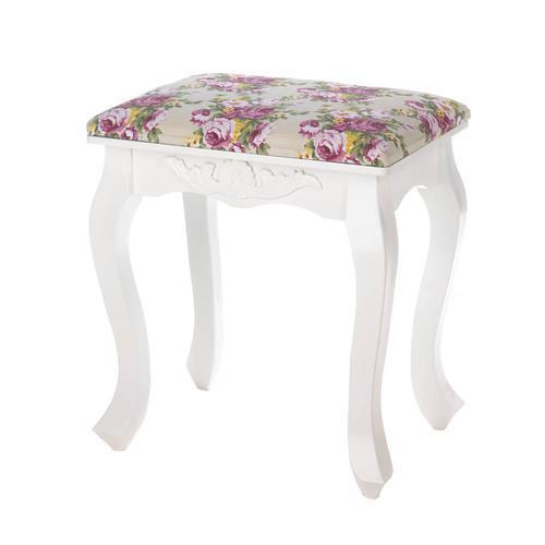 This pure white wooden stool, with a dash of romance built into the curved legs, is topped with a gorgeous cushion that will complement your room. The fabric features lively pink roses and delicate yellow flowers, all set on a neutral background. Its a treat to rest your feet or a pretty perch to have a seat.Item weight: 7.8 lbs. 15" x 11¼" x 17¼" high. MDF wood, pine wood and fabric. Spot clean only. UPC: 849179020545. Some Assembly Required.
