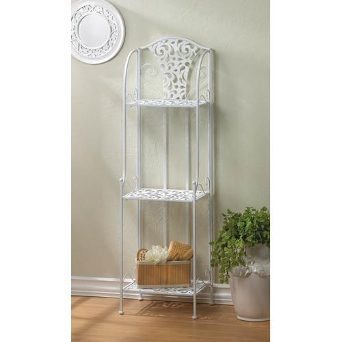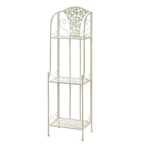 You dont need a lot of space to make a big style statement, and this delicate display rack will prove it! The slender metal framework features fanciful curls and holds three lacy shelves that you can decorate with just about anything.Fits in perfectly in the bathroom, bedroom, living room, and even kitchen. Item weight: 9.8 lbs. 14¼" x 11" x 49" high. Iron. Contents not included. UPC: 849179021375.