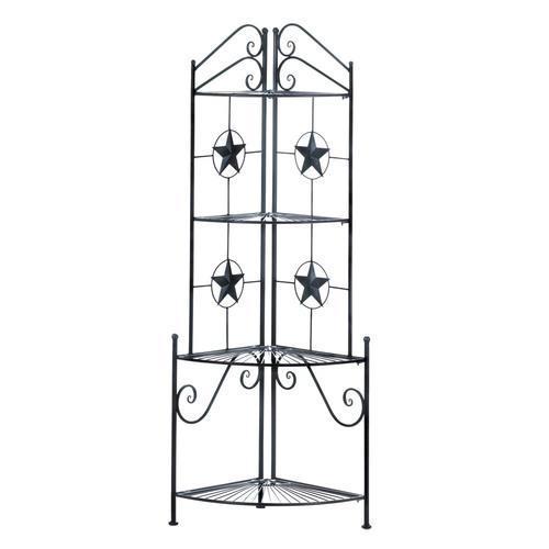 This iron corner shelf is ready to be the star of your room! It features four fanned shelves that are perfect for displaying your collectibles or potted plants, and the star details make it stand out with style.Item weight: 15.6 lbs. 24 7/8" x 17" x 63 3/8" high. Iron. UPC: 849179025410.