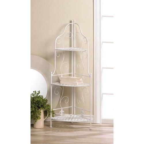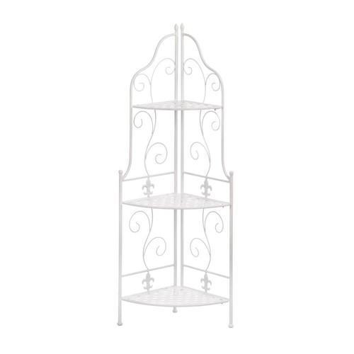 Bring big style to any little corner! This charming corner unit features three basket weave shelves, scrolling flourishes, and fleur-de-lis accents. Its perfect for displaying your collection of keepsakes or your blooming green plants.Weight 11.6 pounds. 17.8" x 12.6" x 46". Iron. UPC Number: 849179027186.