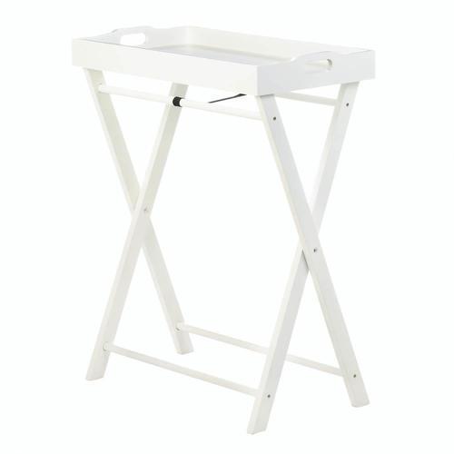 This pretty tray table is easy to use and easy to tuck away when you don't need it! The tray at top is great for holding beverages, snacks and even a couch-side meal. It folds up for easy storage when not in use.Weight 7.6 pounds. 23.6" x 13.6" x 29.2. MDF Wood. UPC Number: 849179031343.