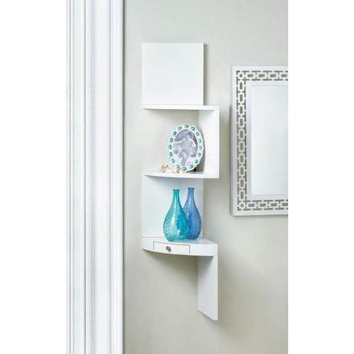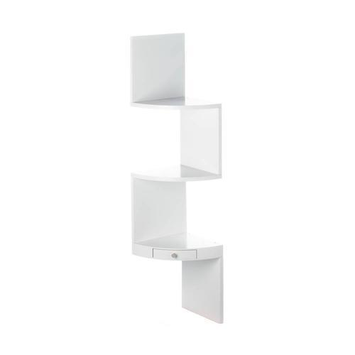 This is the coolest way to transform the corner of your room from wasted space to artistic focal point! This wooden white wall shelf features three small display shelves and the bottom features a miniature drawer. You'll love the way this functional piece of art amplifies the style in your space.Weight 10 pounds. 9.62" x 9.63" x 41.6". MDF Wood. UPC Number: 849179031398.