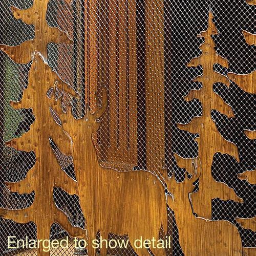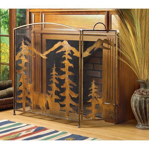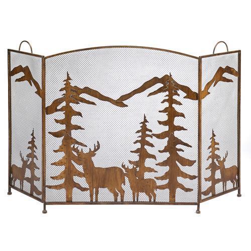 Magnificent metalwork fire screen features cutout silhouettes of deer and mountains; absolutely magical when backlit by firelight!Weathered bronze finish gives this the instant appeal of a well-loved antique. Three-part folding...