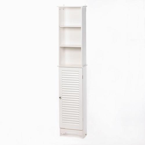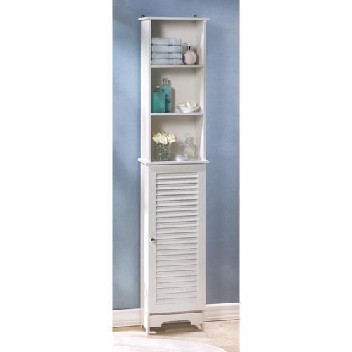 Youll find a thousand uses for this fashionable organizer, from the bathroom to the living room and beyond! Sleek louvered styling and bright white finish let this handsome shelf brighten most any décor.Weight 26 lbs. 13½" x 8" x 65" high. MDF wood. Contents not included. Some Assembly Required UPC: 849179005603