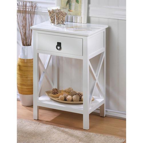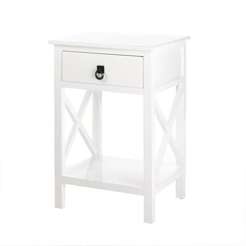 Classic coastal-inspired Hampton Side Table. Lacquered finished in white, this sleek and handsome furnishing features a pullout drawer for storage, highlighted by a contrasting metal pull, and a bottom shelf that can be used for additional storage or display.Item weight: 14.9 lbs. 18¼" x 13 7/8" x 26 1/8" high. Hardwood and MDF. UPC: 849179005092.