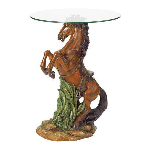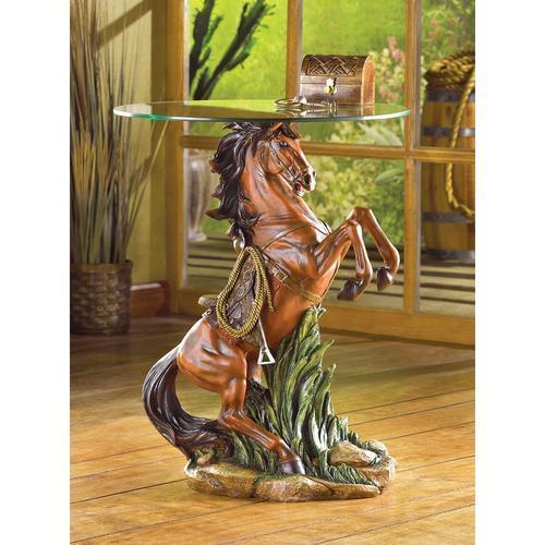 Incredibly lifelike figural accent table is sure to be the focus piece of your dcor. A noble stallion is captured in action as he stands proudly upon his mighty hind...