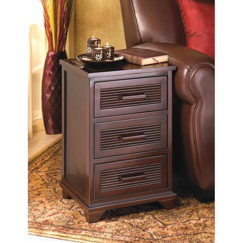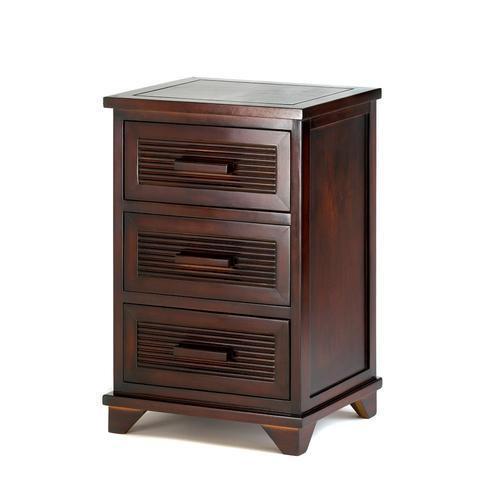 Sleek and attractive, this dark wood-finished end table is equally at home beside a bed, or adding storage next to a sofa. Three roomy drawers hold plenty of items right at easy reach, yet neatly out of sight.Weight 20 lbs. 15" x 12 3/8" x 23" high. Wood and veneer board. UPC: 849179002893.