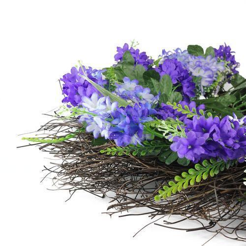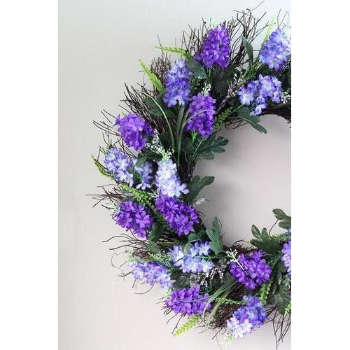 This gorgeous wreath is perfect for Spring to Fall Featuring light and dark purple fabric lilacs with sprigs of heather mixed green foliage on a spiral vine base No assembly...