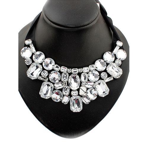 White Crystal Rhinestone Collar Necklace With Silk Tie