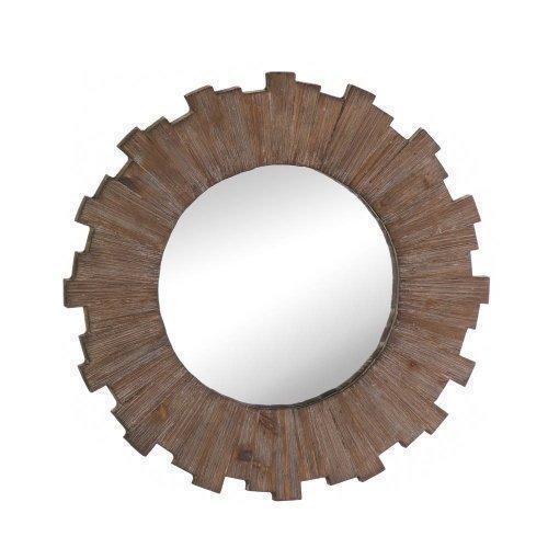 Mid-century style with a modern twist, this gorgeous wooden mirror will be the star of your wall. The round mirror is encased in a singular frame made to look like wooden planks of various lengths, with a deep brown weathered finish. Reflective mirror: 10 1/4" diameter.