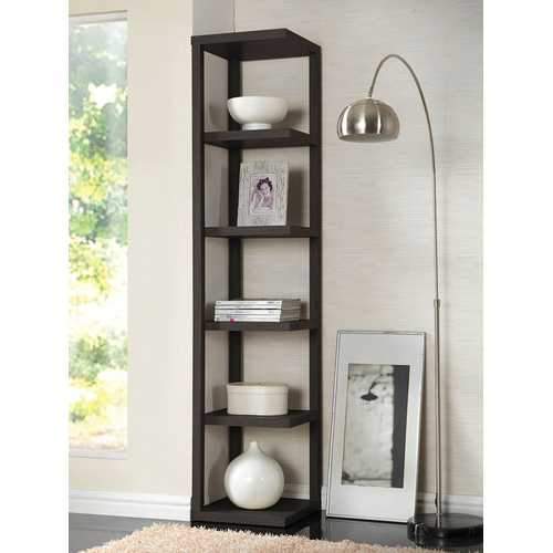 Beautiful dark brown finish corner bookcase has five open shelves offer more than enough space for your besides requirements, whether an alarm clock or a teddy bear or display items. The corner bookcase is finished in a long lasting dark brown laminate. It combines with curve front design. With this embellished corner bookcase you can enhance the beauty of your home decor. This sturdy and elegant corner bookcase is made from durable premium hardwood materials.Case Pack: 1Color: Dark BrownMaterial: WOODNumber Of Cartons: 1Total Carton Weight ( lbs. ): 43Total Carton Length ( in. ): 74Total Carton Depth ( in. ): 2.5Total Carton Height ( in. ): 13.75