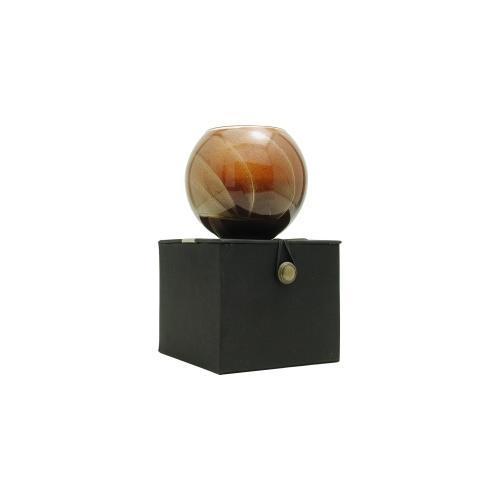 THE INSIDE OF THIS 4 in POLISHED GLOBE IS PAINTED WITH WAX TO CREATE SWIRLS OF GOLD AND RICH HUES AND COMES IN A SATIN COVERED GIFT BOX. CANDLE IS FILLED WITH A TRANSLUCENT WAX AND SCENTED WITH MYSTERIA. BURNS APPROX. 50 HRS