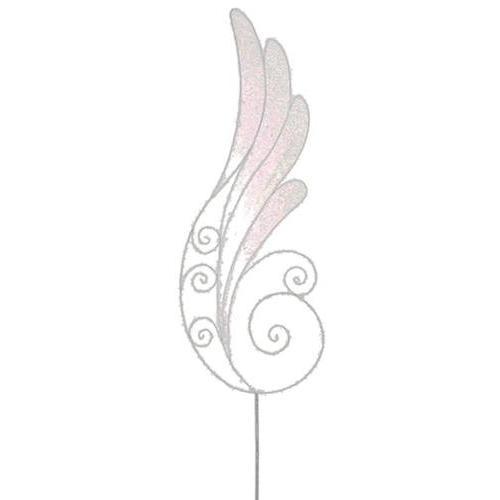 White Iridescent Glittered Wing Craft Pick Item #XAR356-WH/IR Wing-shaped iridescent white craft picks accented with decorative scrolls and glitter make a dazzling addition to any festive floral arrangement or Christmas tree Dimensions: Wing: 24"L x 9"W (at widest point) Stem: 14.5"L Total length: 38.5"L Material(s): glitter/plastic/wire