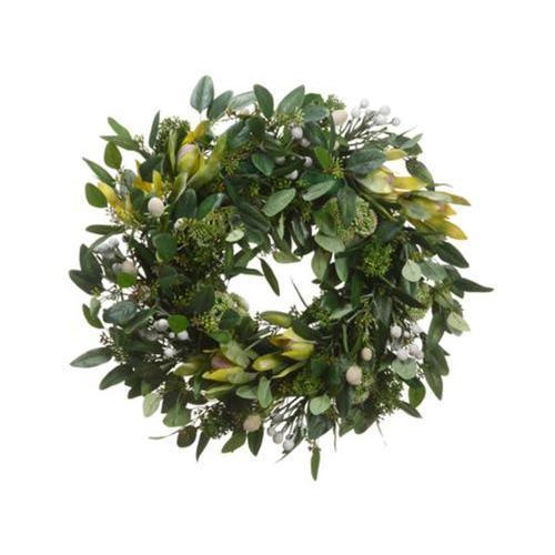 This wreath features Protea and Sedum flowers and is accented with mixed green foliage Lush green foliage gives this wreath a nice full look No assembly required wreath comes in 1 piece Recommended for indoor use Dimensions: 19" diameter (measured from outermost tip to outermost tip) Material(s): polyester/PVC/PE/metal