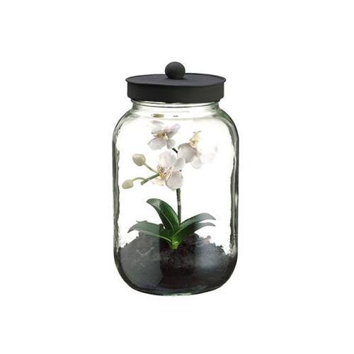 Features (3) realistic mini white and soft pink phalaenopsis orchids Comes in a glass terrarium style jar with faux soil Lid is removable Recommended for indoor use only - if using outdoors place under a covered area Dimensions: 11.25" high x 6" diameter Material(s): glass/polyester/polymer/metal