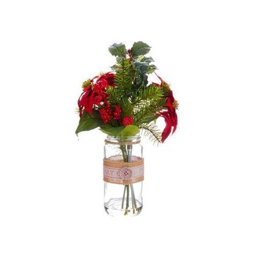 Features two beautiful artificial red poinsettia flowers holly and pine needles Comes in a mason jar vase that is accented with "water" wrapped in a burlap band with a button...