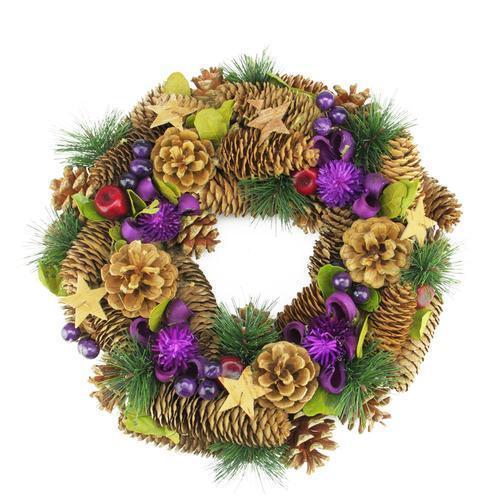 Add a special touch to your holiday decor with this beautiful pine cone and berry wreath Features assorted frosted pine cones pine needles and wooden stars Includes purple and red berries Unlit For indoor use only No assembly required â€" wreath comes in 1 piece Twine loop for easy hanging Includes a foam frame backing Dimensions: 13" diameter (measured from outermost tip/edge to outermost tip/edge across the wreath) Material(s): pine cone/jute/foam/wood