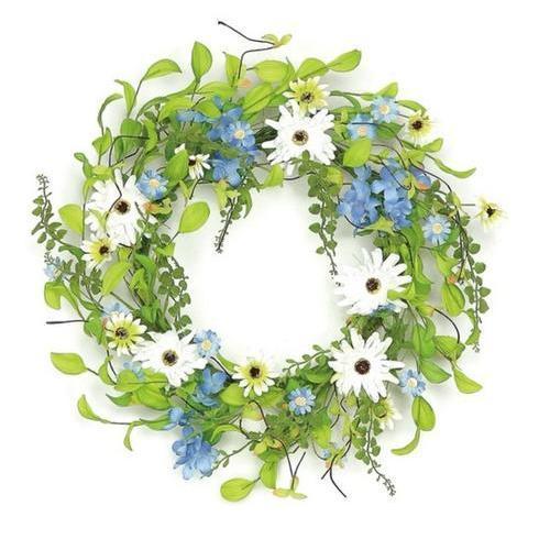 Blue and white hydrangeas and wild daisies are featured in this wreath that would make a wonderful addition to any spring decor Accented by mixed foliage No assembly required - wreath comes in 1 piece Comes ready to hang on a green artificial branch ring Recommended for indoor use Dimensions: 22" diameter (measured from outermost tip to outermost tip) Material(s): fabric/PE