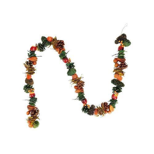 Decorate staircases and hallways with this bright harvest garland Perfect for Thanksgiving and fall celebrations Comes ready-to-hang on a brown cord For indoor decoration only Dimensions: 5' long x 3" diameter Material(s): pine cones/plastic/wire